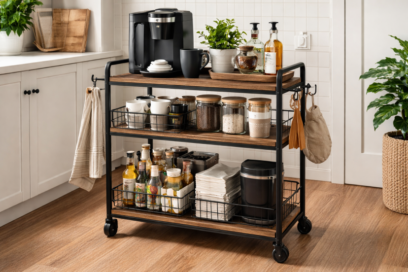 If counter space is limited, go vertical. Install floating shelves above a slim console or rolling cart. This keeps the base footprint small while maximizing storage.